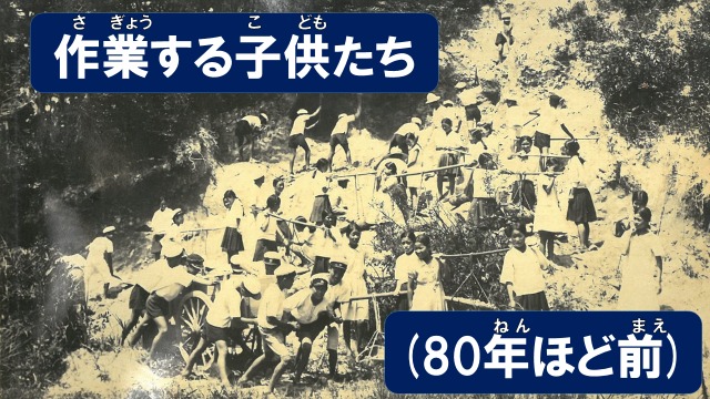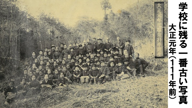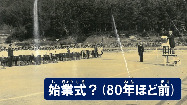 今から150年前の明治6年に「今田校」が今田新田にできたのが、歴史の始まりであること、そして今に至るまでのできごとを学校に残る写真を使いながら話しました。