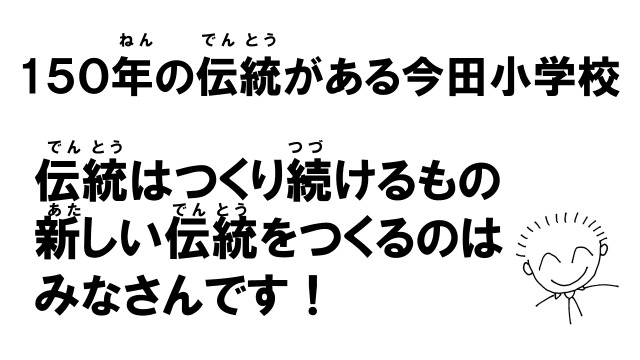 そして、伝統はつくり続けるものであり、新しい伝統をつくるのは今の今田小学校のみんなであり、みんなには伝統をつくって次につなぐことが大切であることを伝えました。