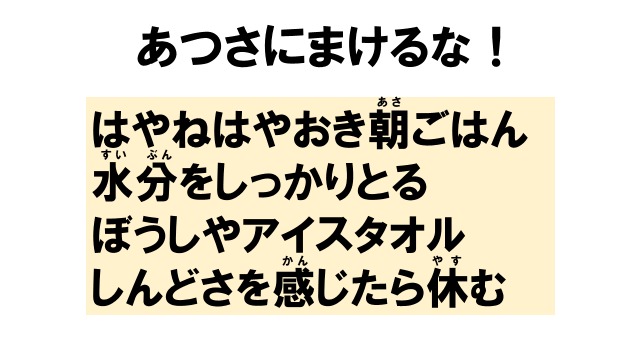 水分をしっかりとること、帽子やアイスタオルを使うこと、しんどさを感じたら休むことを伝えました。