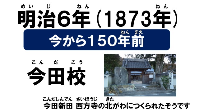 一つめは、8月30日の創立記念日を控え、今田小学校が創立150周年であるというお話です。