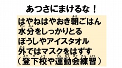 もうひとつ「暑さに負けるな!」のお話です。運動会の頃までは暑い日が続きます。早寝早起きをして朝ご飯をしっかり食べること、水分をしっかりとること、帽子やアイスタオルで身を守ること。そして、登下校や運動会の練習など外で活動するときはマスクを積極的に外しましょう。